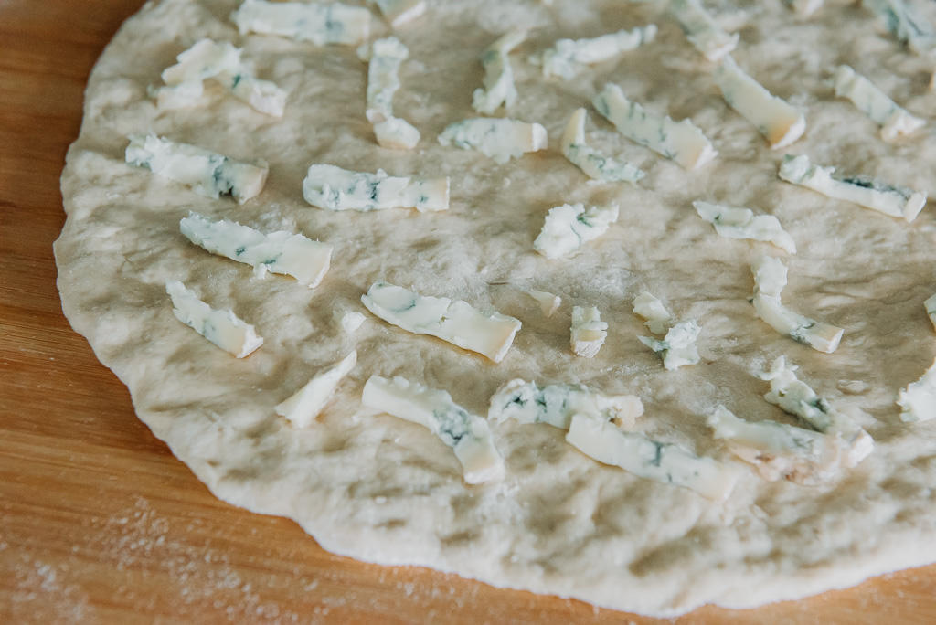 Po uformowaniu kształtu pizzy, rozdrobniony ser gorgonzola nałożyć na całość.