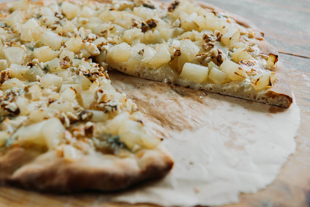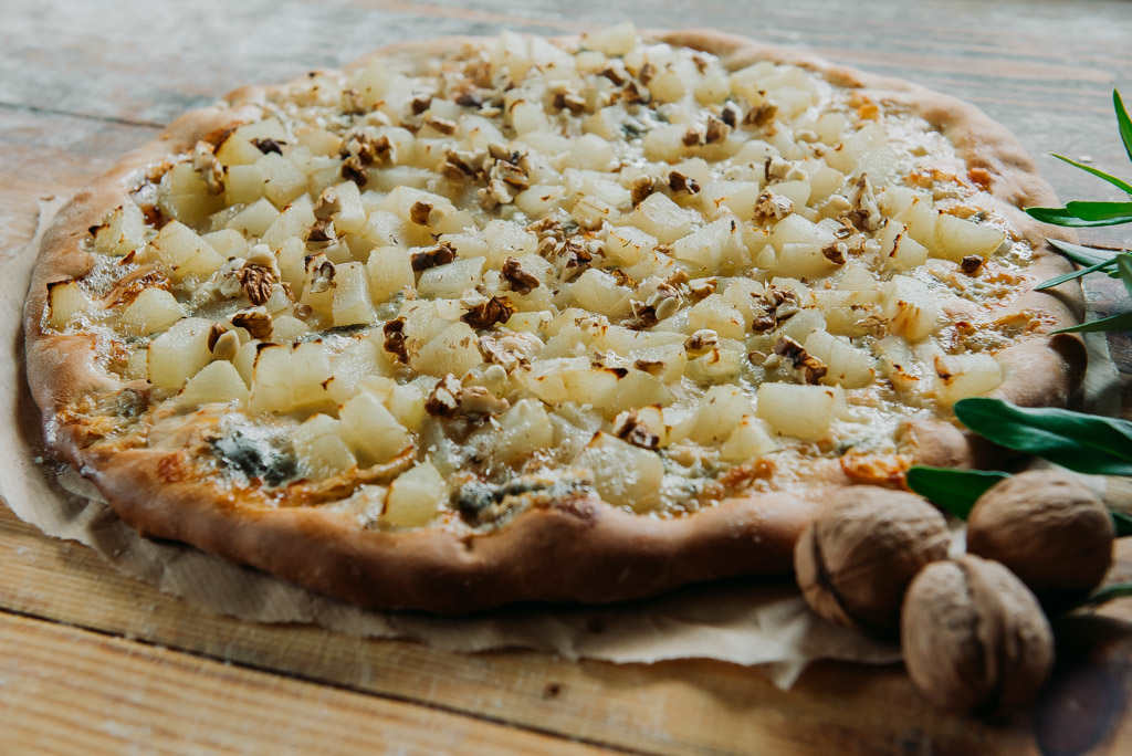 Pizza z gorgonzolą, gruszkami i orzechami włoskimi